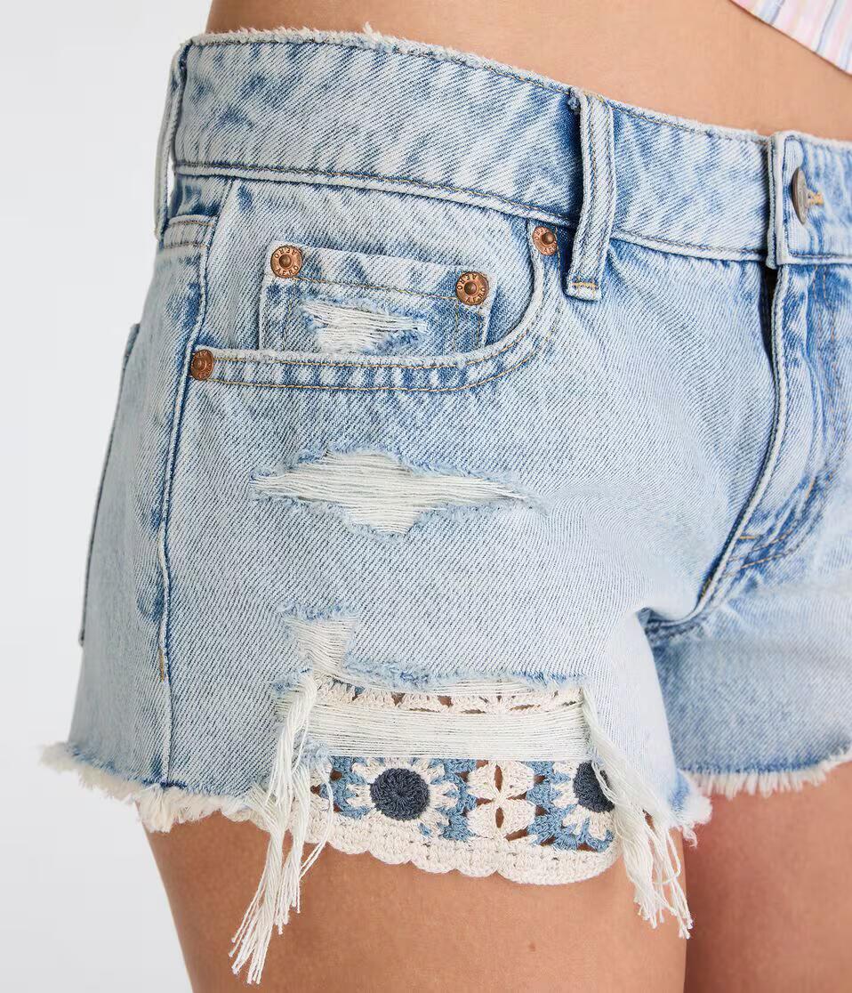 Classic destroyed denim shorties with the cutest crocheted pocket bags peeking out beneath the hems. Fabric features recycled cotton, which is crafted from a mix of pre- and post-consumer waste to help reduce landfills.